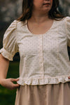 The ever popular Charlie top is back in the sweetest polka dot print! This top is well loved my many for its darling details and comfy fit. It works so well with skirts and jeans alike, and the polka dots are cute for all seasons :) Shown here with the Loretta skirt and Eliane cardigan.