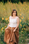 The Emily top is elegant and sophisticated. It goes perfectly with any skirt and the sweet spaghetti straps make it ideal for layering. The eyelet details are so sweet and the drawstrings are functional! This is one you will wear over and over again. Shown her with the Alexa skirt and Elaine cardigan.