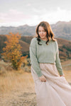 The Janelle sweater is a beautiful sage colored pullover that is so versatile. The color goes with so many things and works in different seasons. It would also be darling paired with skirts and over dresses, like the Rachael shown here :)