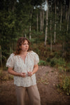 The Jessie top is such a feminine statement piece. I love the ruffle details on the shoulder and the sweet pink and green floral print. It looks cute left out or tucked in a skirt or jeans! The sleeves would also be adorable under a pair of overalls like the Winston :)