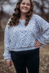 Floral print on a heather grey fabric. And this one is 100% cotton! It is very cozy and comfortable and has a fun upside-down triangle stitching detail along the collar. The sizing is very flexible on this one :)