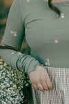 This beautiful top is a great piece to have in your closet because it is so versatile :) The sage color goes with so many things and the ruffle hem and embroidery flowers elevate it. Paired here with the Emily skirt and Adrian vest.