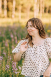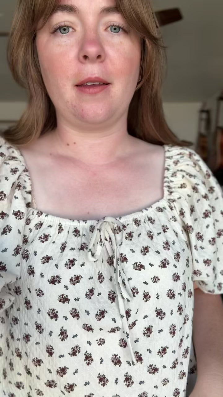 The Kimberly blouse is so feminine and delicate, and flattering on many different body types! The square neckline with elastic makes it functional for nursing :) This print has sold out many times in other cuts and I expect the same for this one! She's the perfect top for summer, fall and winter :)